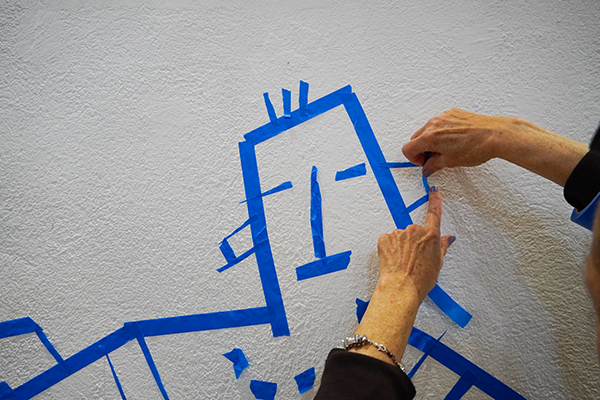 After a short musical warm-up to activate the body and explore different poses, participants are invited to create a temporary collective mural using blue masking tape, a playful and unexpected medium that allows for all kinds of lines to be drawn directly on the walls.